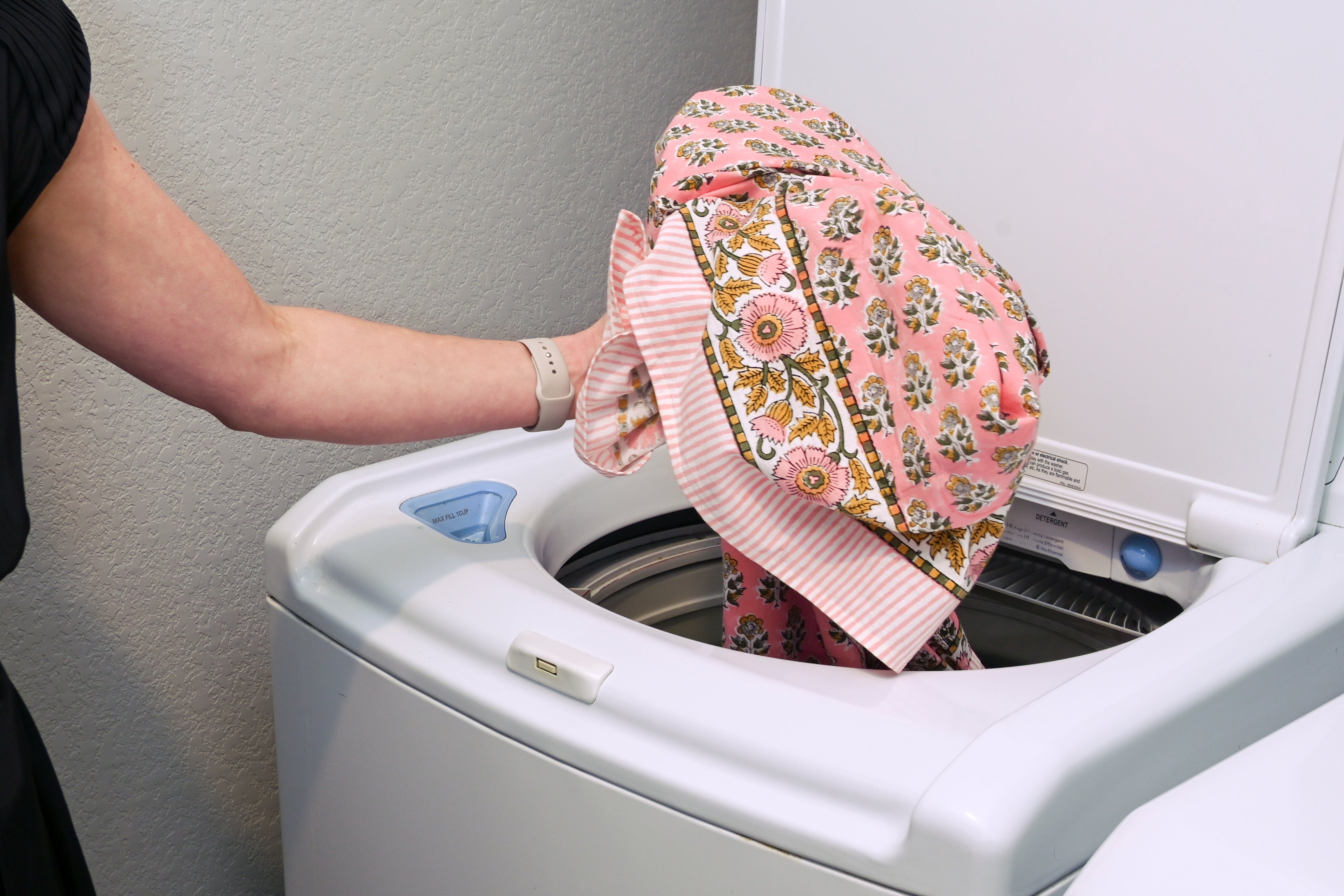 Our 100% cotton tablecloths, napkins, and other products are machine washable for your convenience. Wash on a gentle cycle with cold water.