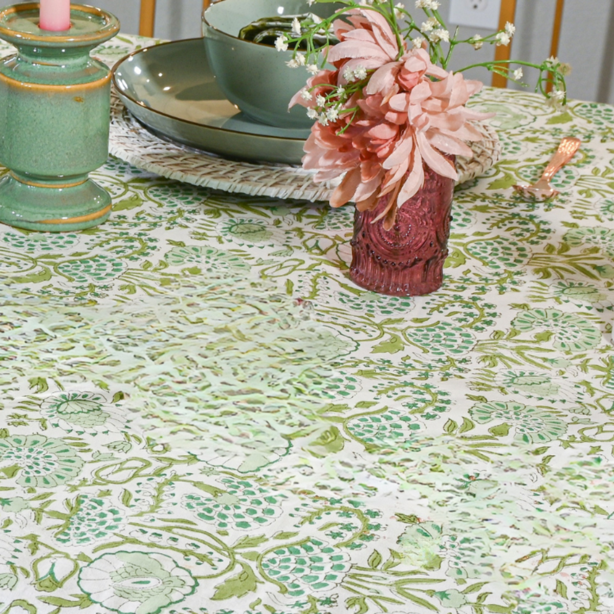 Transform your dining space with our handmade block print cotton tablecloths, designed for lovers of grandmillennial, farmhouse, and vintage home decor. Whether you're hosting a casual brunch or planning a formal wedding reception, these elegant yet practical table linens bring charm and character to any occasion.