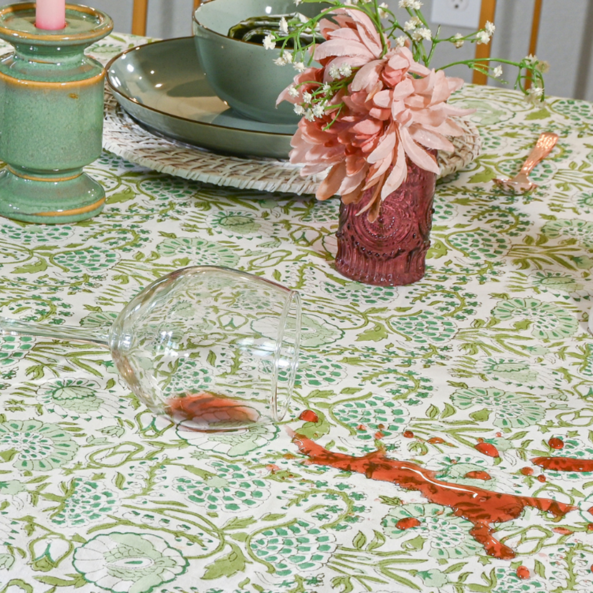 Our 100% cotton hand block printed tablecloths are as practical as they are beautiful. Whether it’s a splash of red wine or a messy dinner party moment, these heirloom-quality fabrics are machine washable and made to clean up with ease — no stress, no stains left behind.