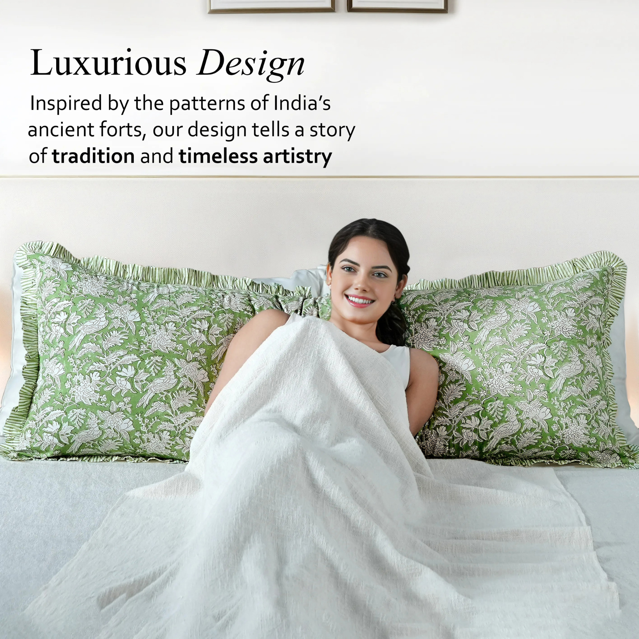 Add a touch of romantic elegance to your bedroom with our handmade cotton ruffle sham cover. Designed for farmhouse, grandmillennial, and cottagecore bedding, this block-printed pillowcase features delicate ruffle trim, soft breathable cotton, and timeless floral patterns.