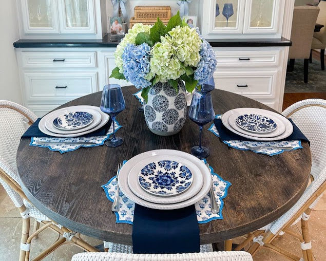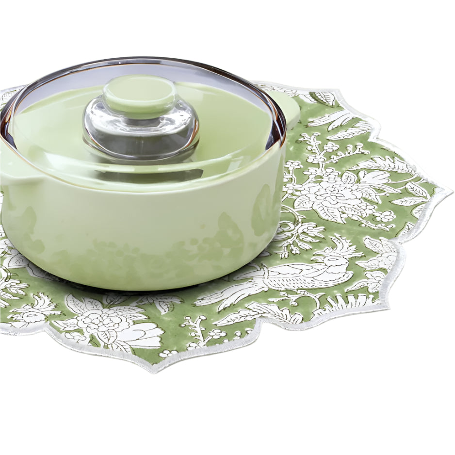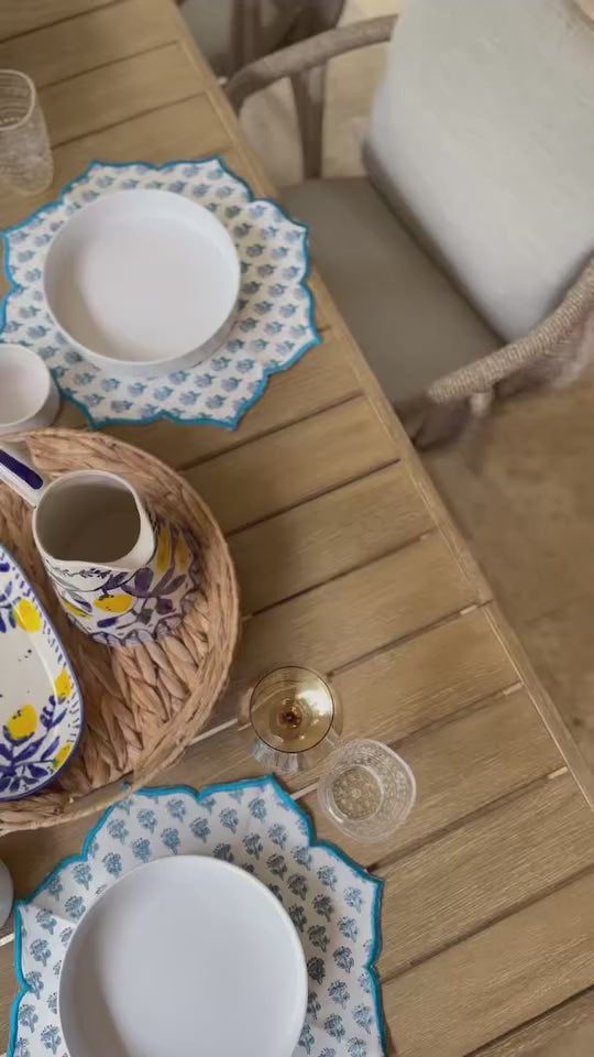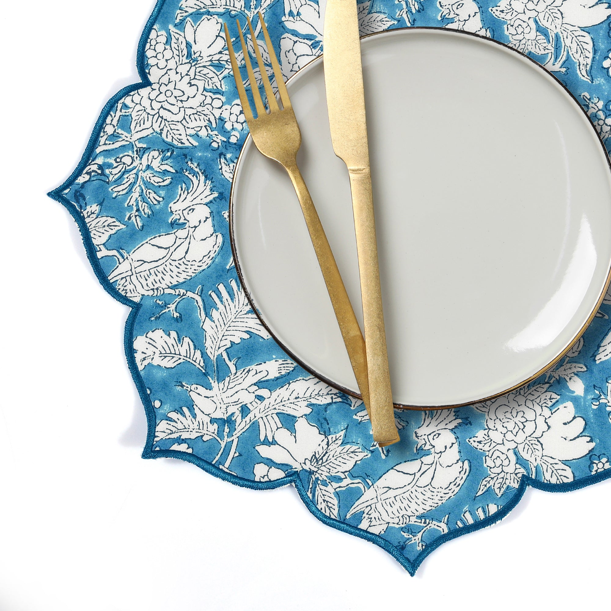 Create an elegant dining experience with our handmade block print cotton placemats, featuring delicate scalloped edges, floral embroidery, and a double-layered design for a luxurious, heirloom-quality touch. Perfect for everyday dining, special occasions, and holiday tablescapes, these placemats add warmth and sophistication to your home.