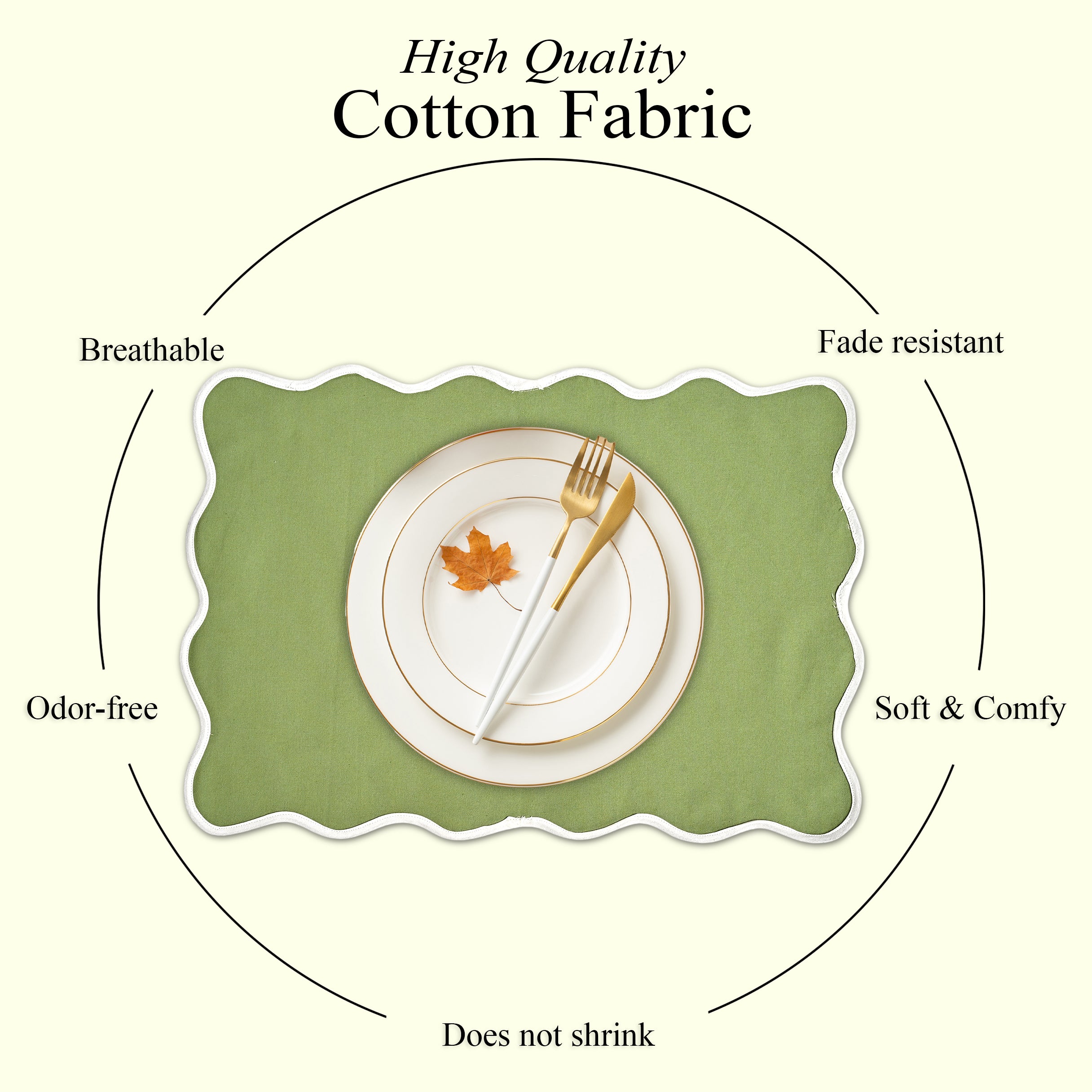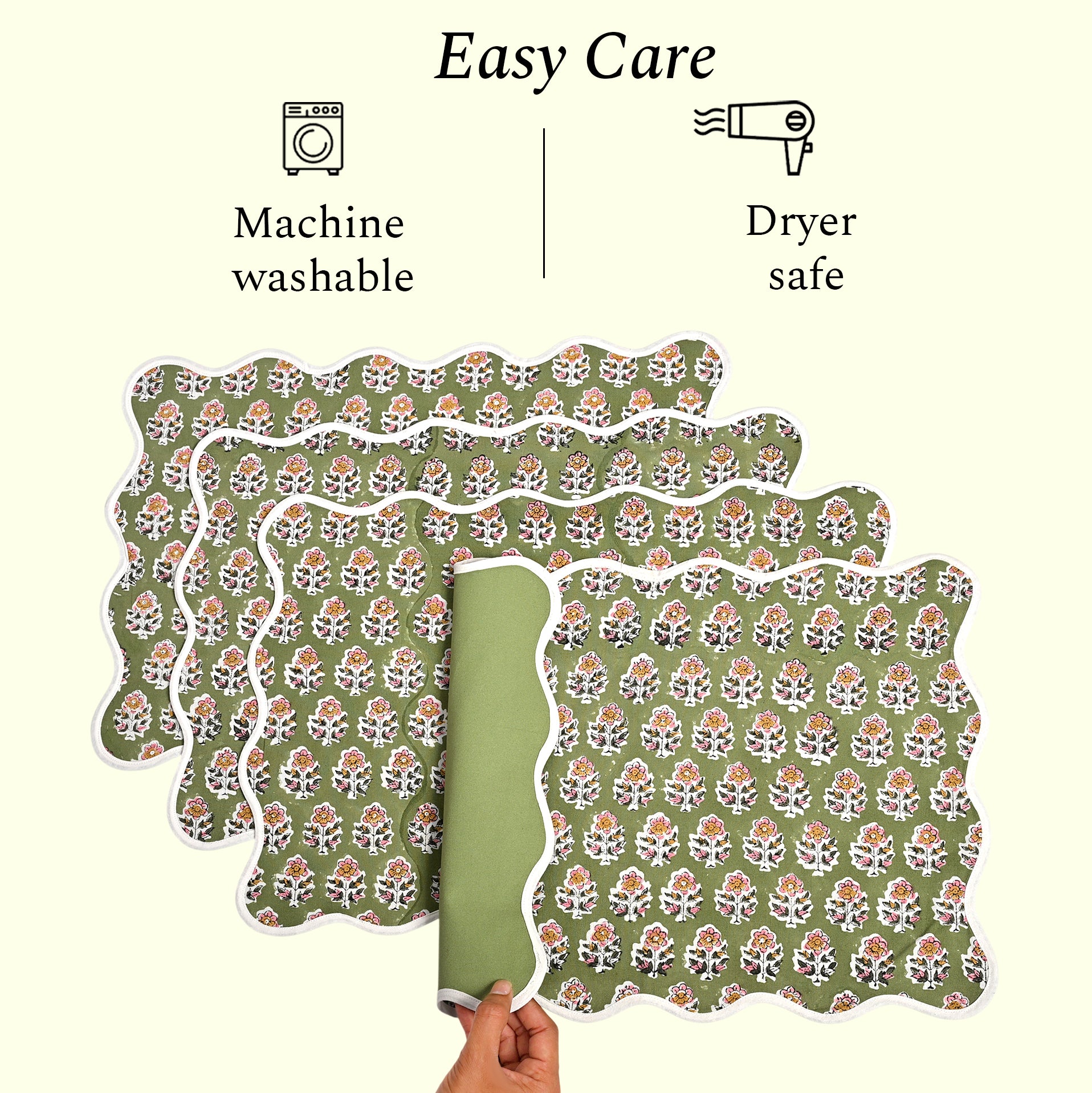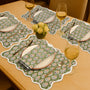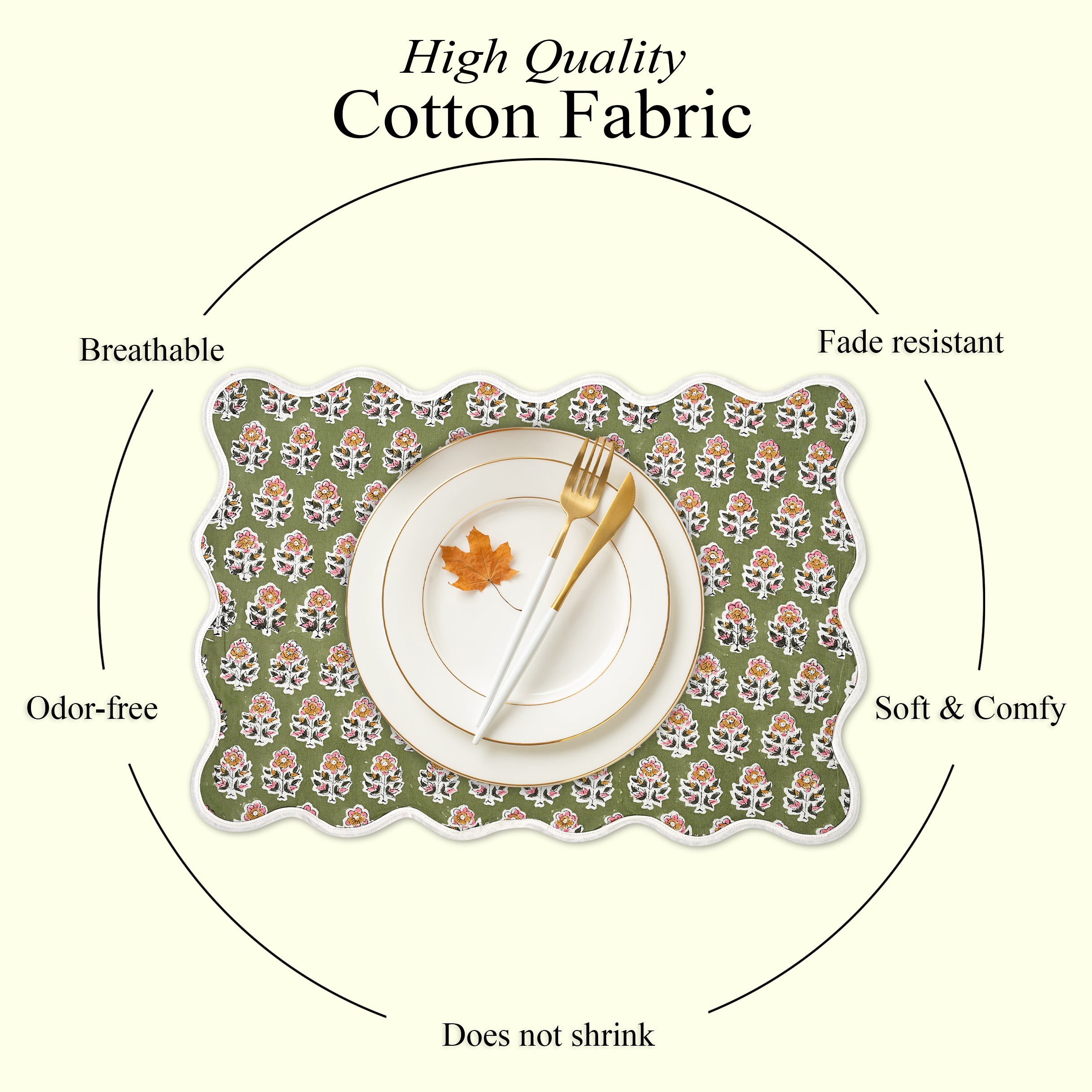 Each placemat is hand-printed and embroidered by artisans, crafted with care from 100% breathable cotton. The scalloped edges and double-layered design add a touch of vintage charm that feels both luxurious and familiar.
