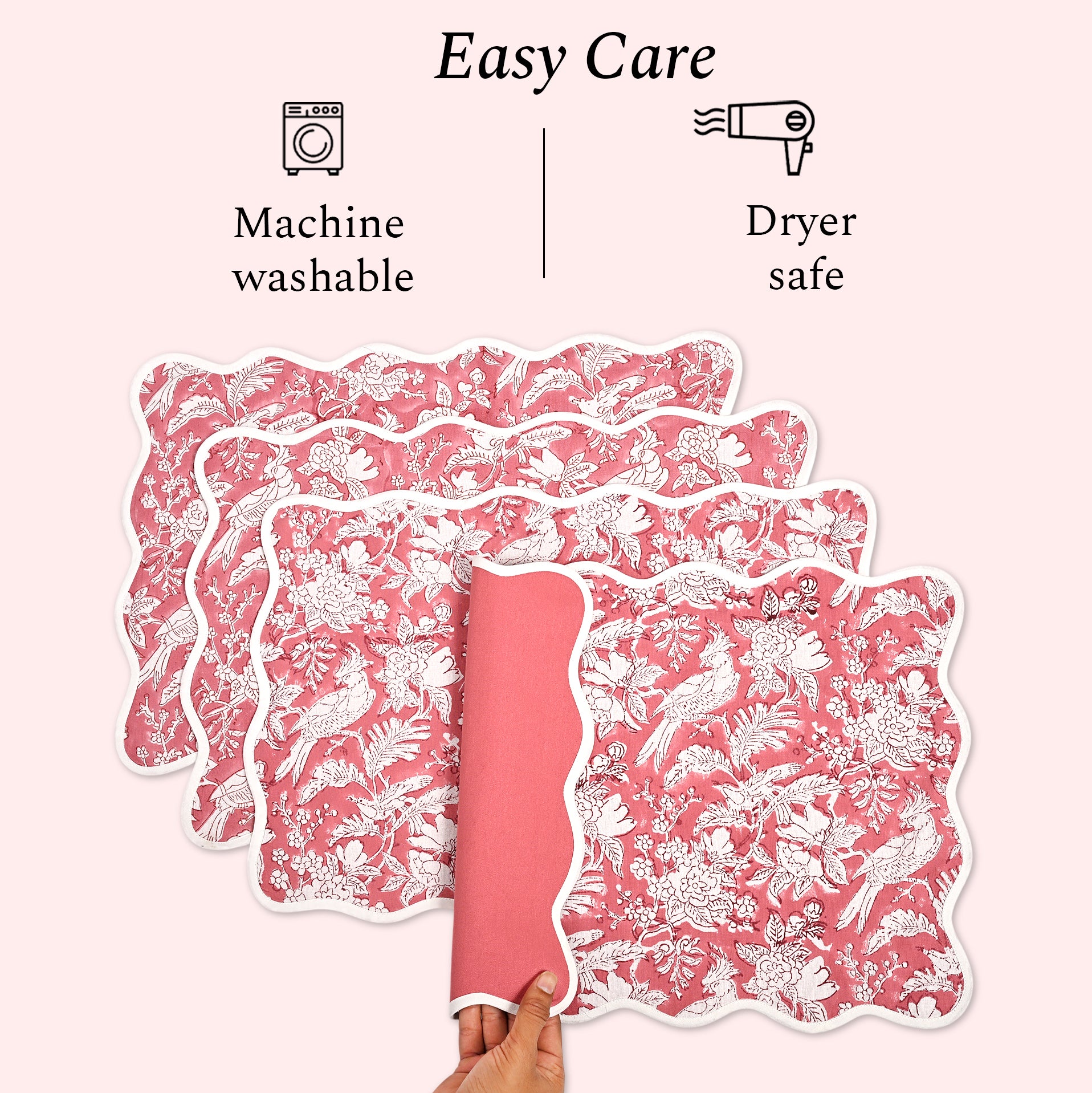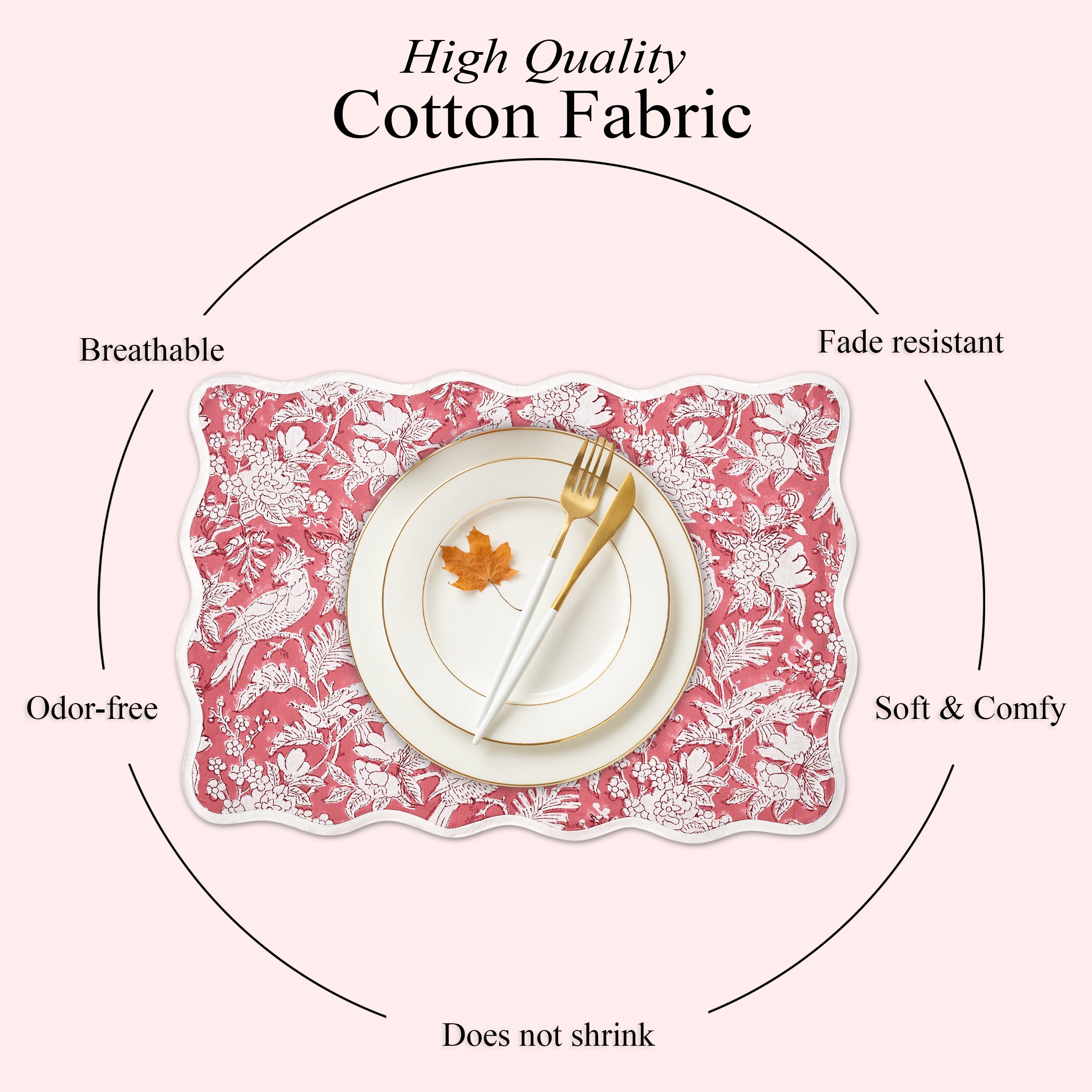 Each placemat is hand-printed and embroidered by artisans, crafted with care from 100% breathable cotton. The scalloped edges and double-layered design add a touch of vintage charm that feels both luxurious and familiar.