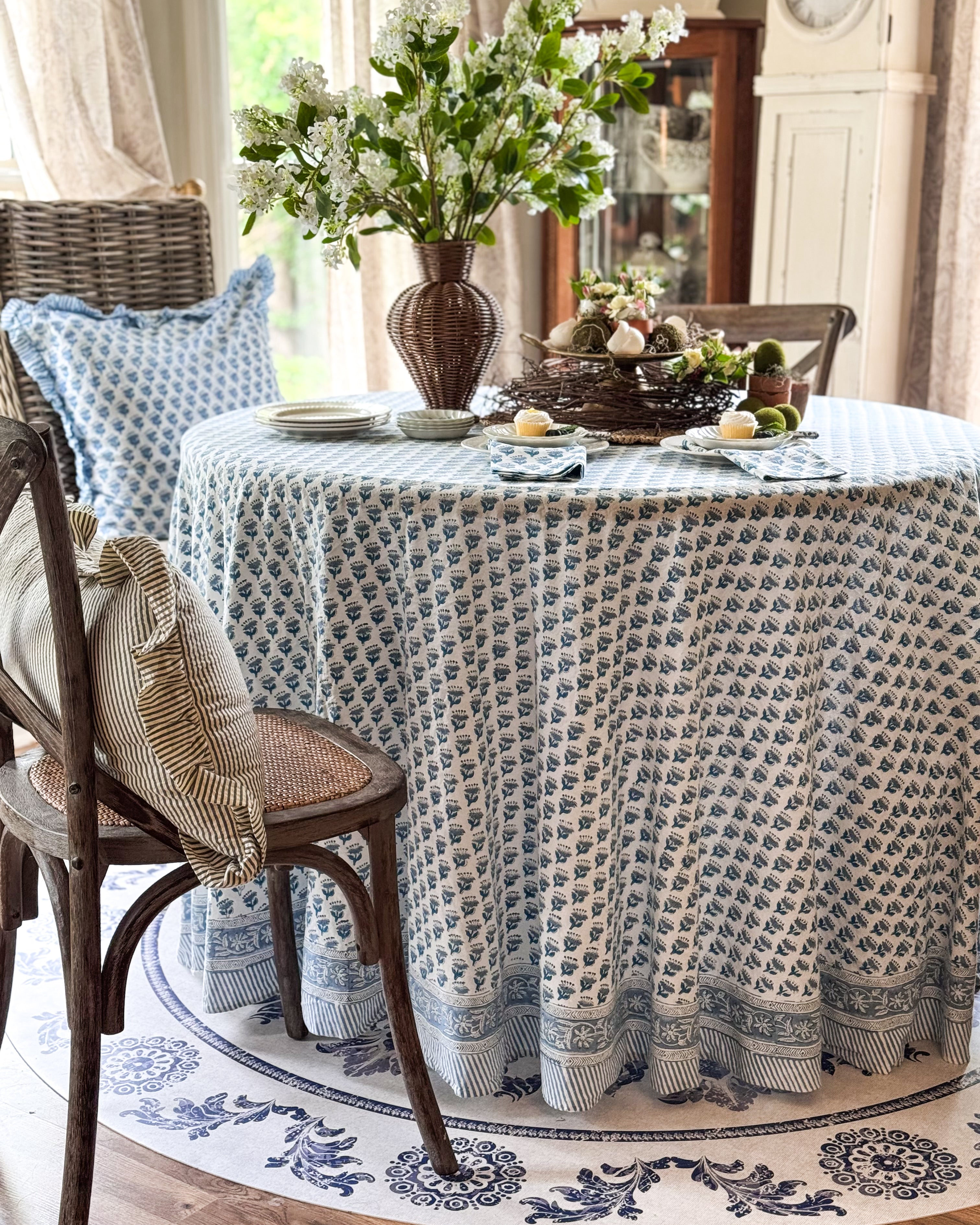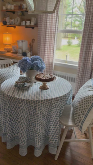 Bring elegance to your home with our handmade round cotton tablecloth, featuring vintage block print patterns perfect for grandmillennial, farmhouse, and cottagecore spaces. These lightweight yet durable linens are ideal for formal dining, weddings, and special occasions, adding a timeless charm to every table setting.