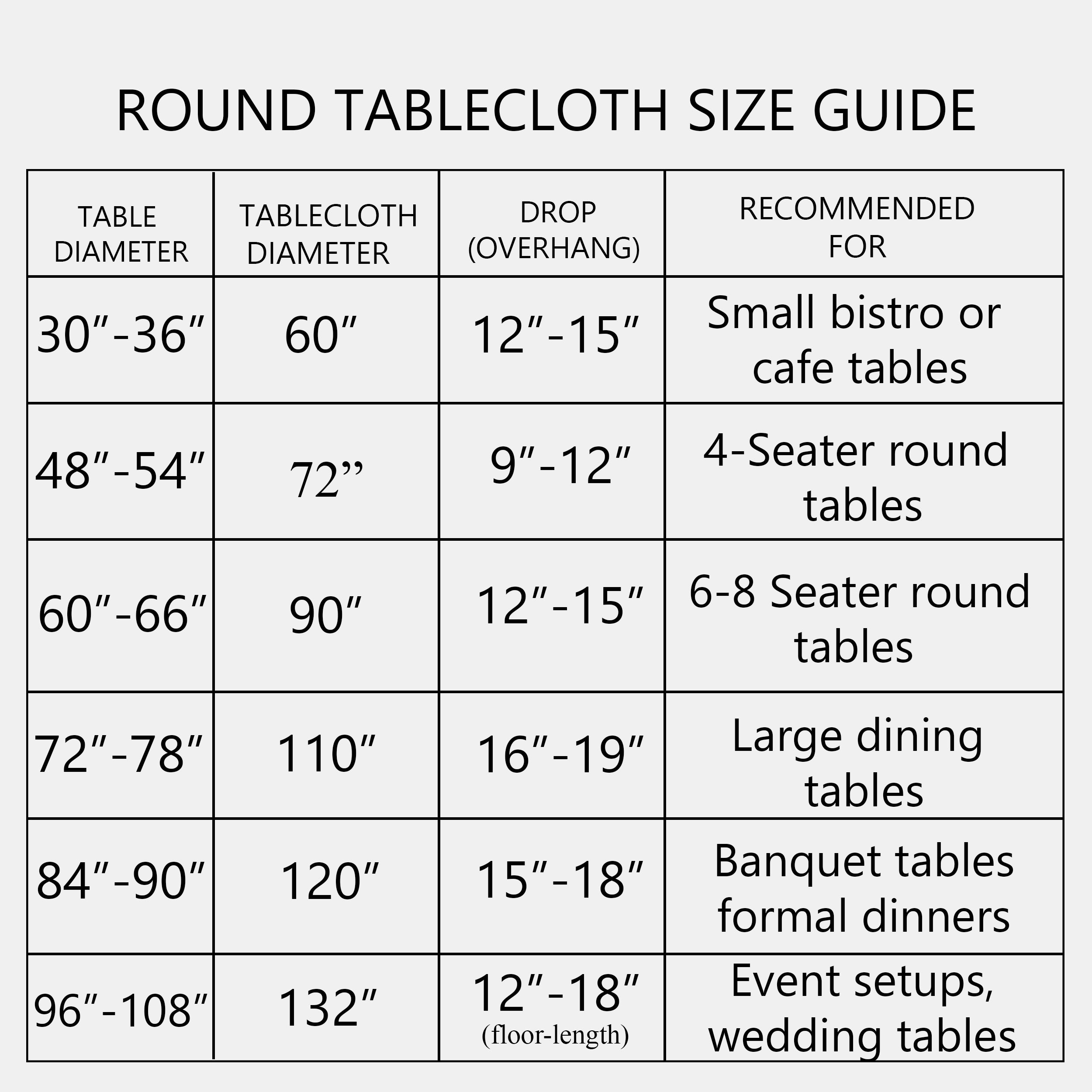 | Round Table Size Diameter | Recommended Tablecloth Size | Seating Capacity |