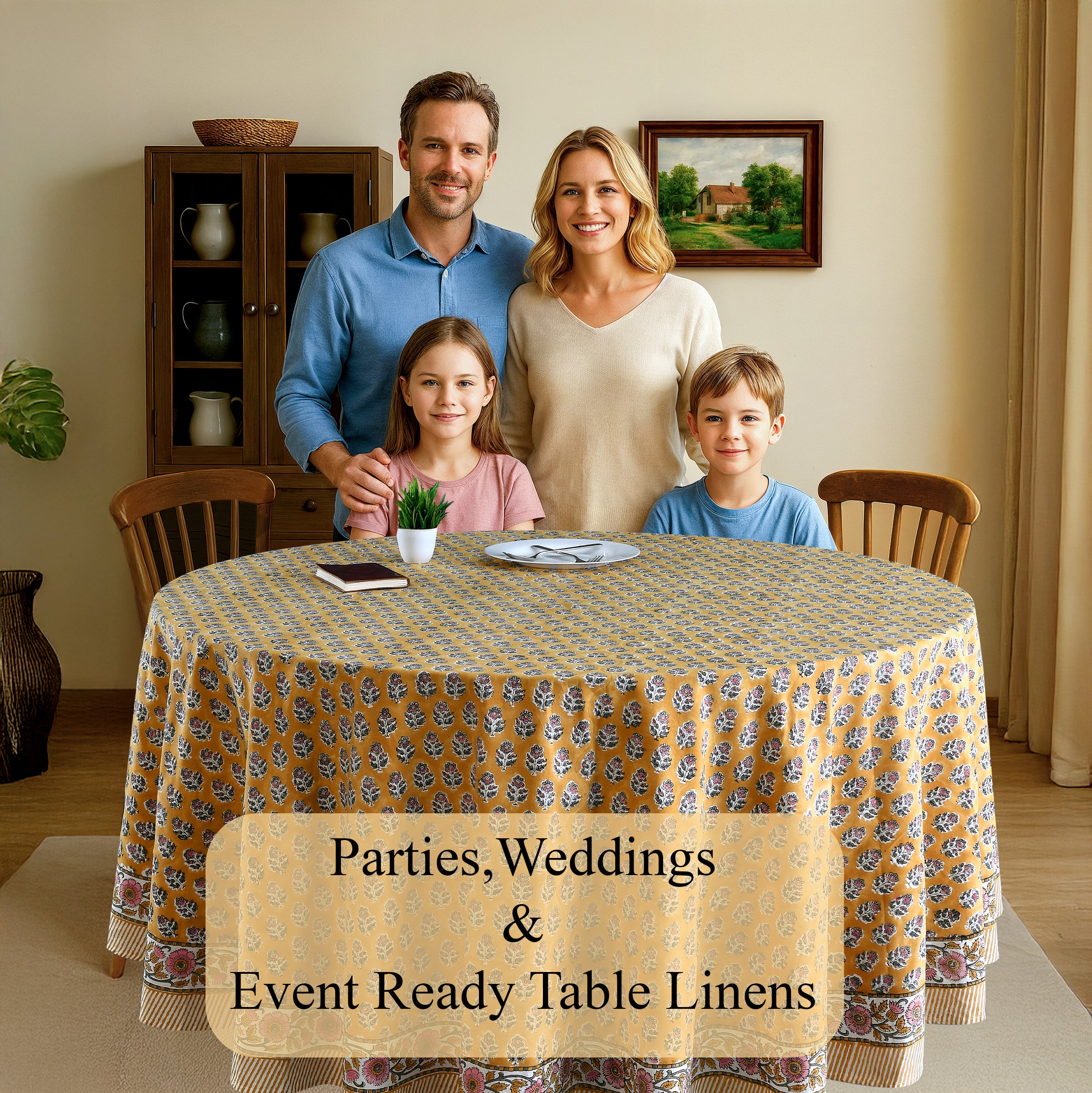 Bring elegance to your home with our handmade round cotton tablecloth, featuring vintage block print patterns perfect for grandmillennial, farmhouse, and cottagecore spaces. These lightweight yet durable linens are ideal for formal dining, weddings, and special occasions, adding a timeless charm to every table setting.